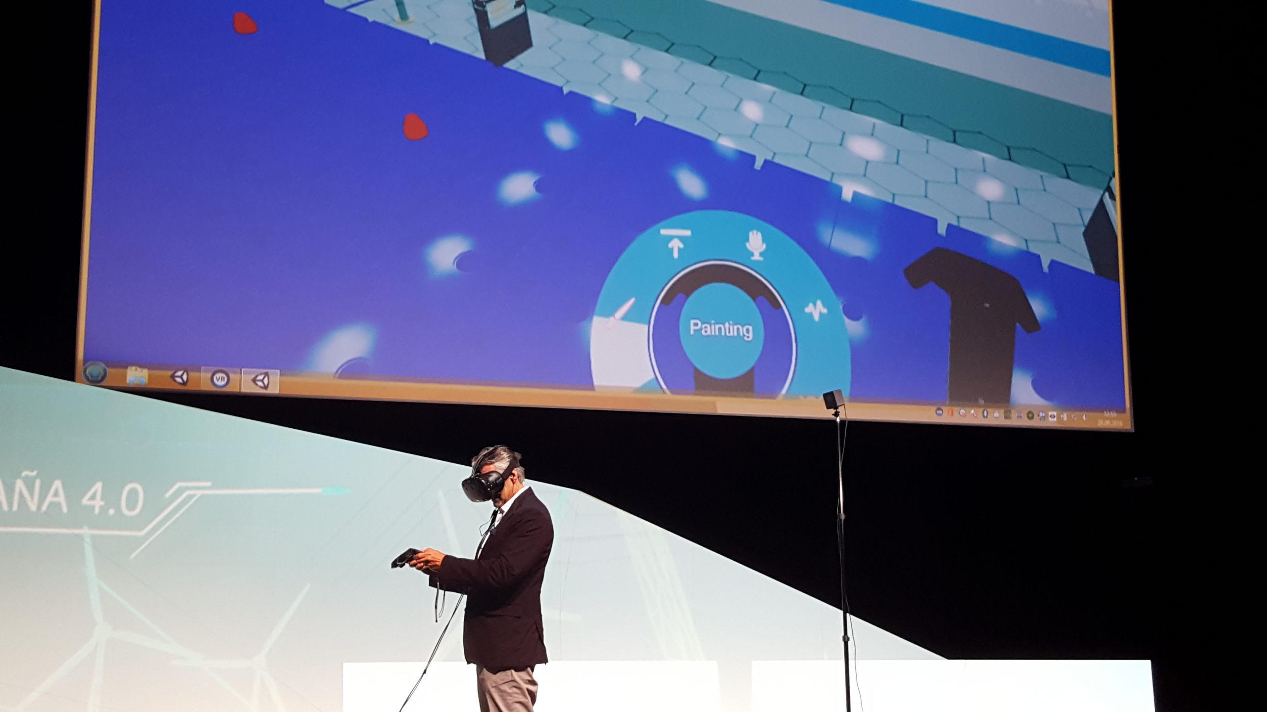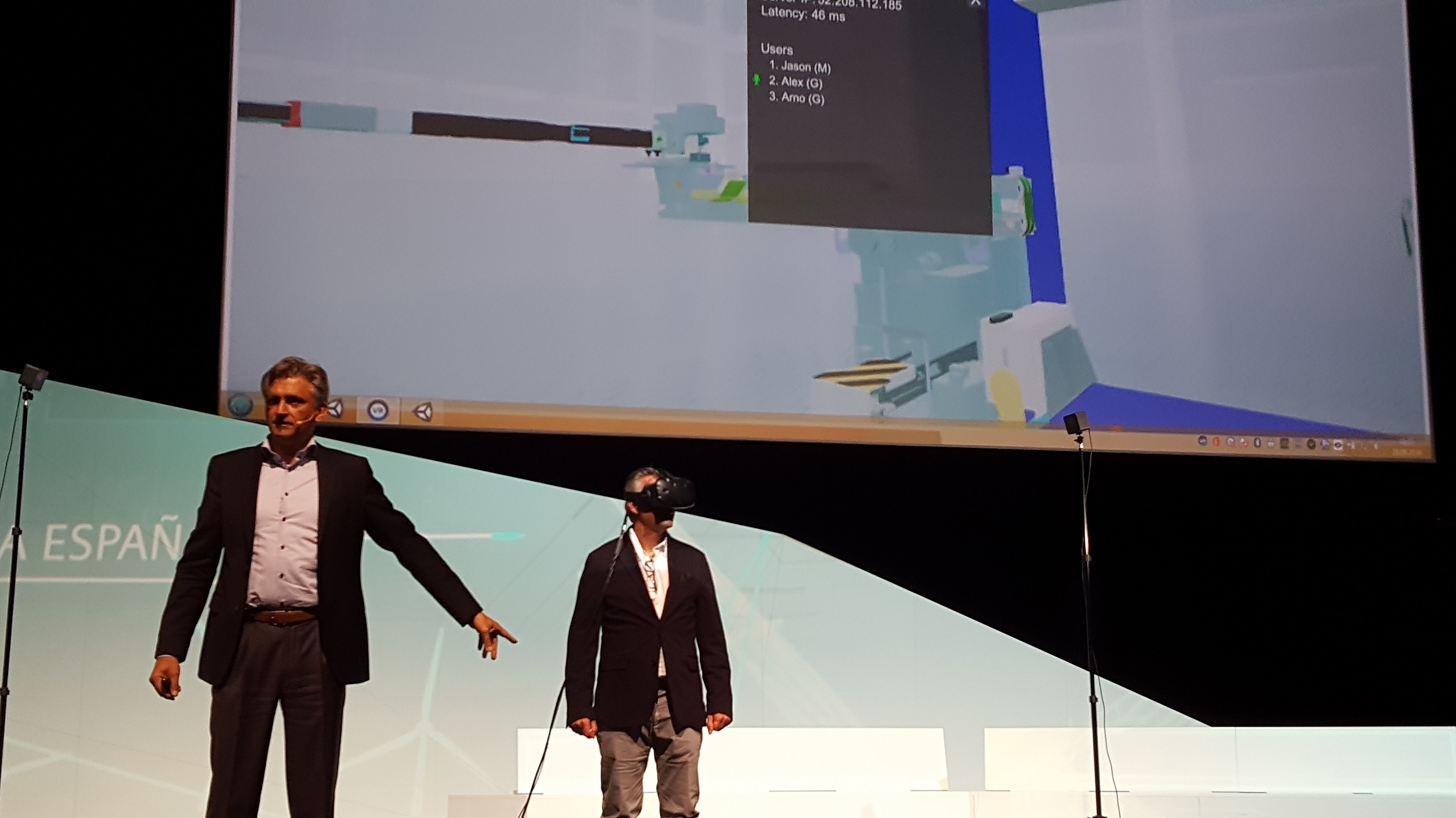 Durante esta jornada tuve la suerte de subir al escenario principal del evento para junto a Alexander Boray para probar una aplicación de Realidad Virtual aplicada al sector de la automoción, donde simulábamos la asistencia técnica por parte de un ingeniero en remoto que me estaba dando instrucciones para la reparación de una máquina para la fabricación de capos de coche. Una gran experiencia.